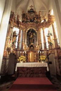 Oltar je bogato pozlačeno baročno delo umetnika Michaela Stiggerja iz leta 1794. Niz štirih pozlačenih stebrov nosi arhitrav, nad katerim se dviguje iz lesa izrezljana podoba svete Trojice. V oltarni niši (apsidi) stoji leseni kip Marije, ob njem sta kipa njenih staršev Joahima in Ane, med stebri pa kipa svete Barbare in svete Katarine.