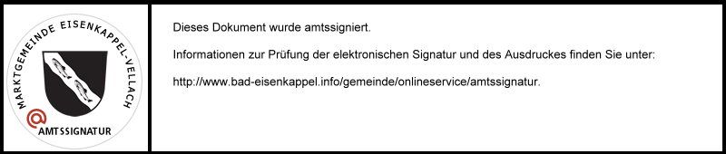 Die Marktgemeinde Eisenkappel-Vellach verwendet die Amtssignatur in verschiedenen Verwaltungsbereichen. Allein durch die Umstellung auf den digitalen Akt, kommt die Amtssignatur verstärkt in Anwendung. Die Darstellung erfolgt dabei in folgender Form: